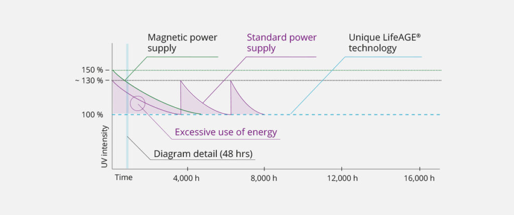 The magic lies in the dynamic release of energy needed to economically manage the intensity of UV radiation. The medium-pressure LifeUVM® system with the LifeAGE® technology emits UV intensity copying the minimum required radiation intensity curve. This system is autonomous. Therefore, it does not need to be connected to any external device that controls it to achieve this optimal intensity course. Therefore, the life of the UV lamp can be increased to up to 18,000 operating hours.