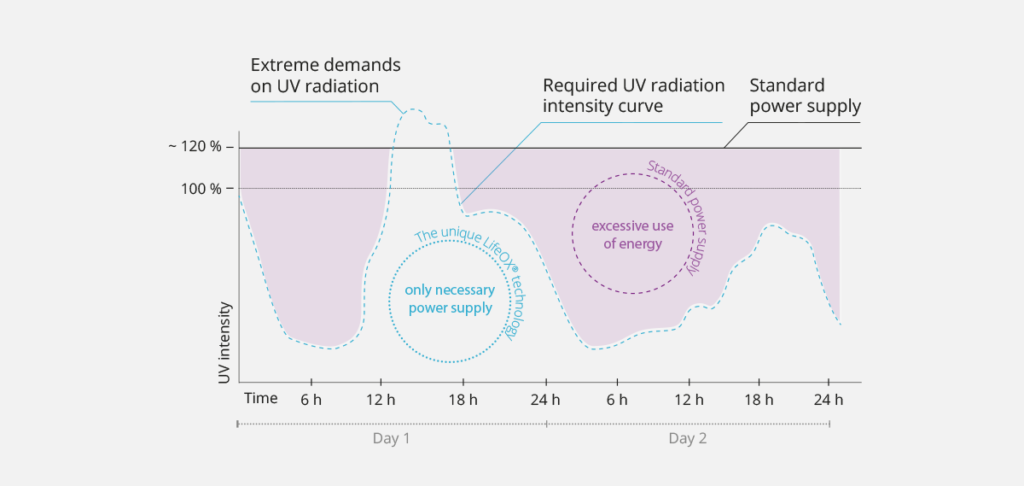 The LifeAGE® technology automatically ensures the operation of the medium-pressure UVM system at all times with the lowest required UV power and power consumption.